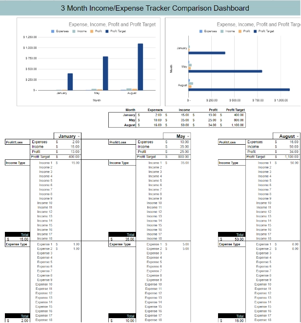 - Compare Expense, Income and Profit with a choice of 3 months.